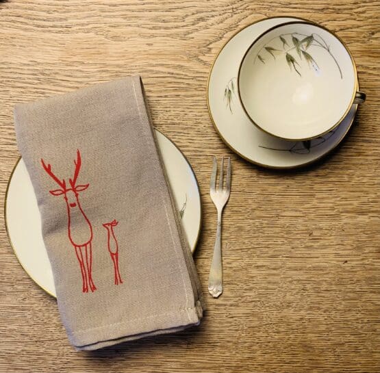 Die hochwertigen und robusten leinfarbigen Servietten aus Halbleinen wurden per Hand mit wasserbasierter Farbe bedruckt. Jede Serviette ist ein Unikat.