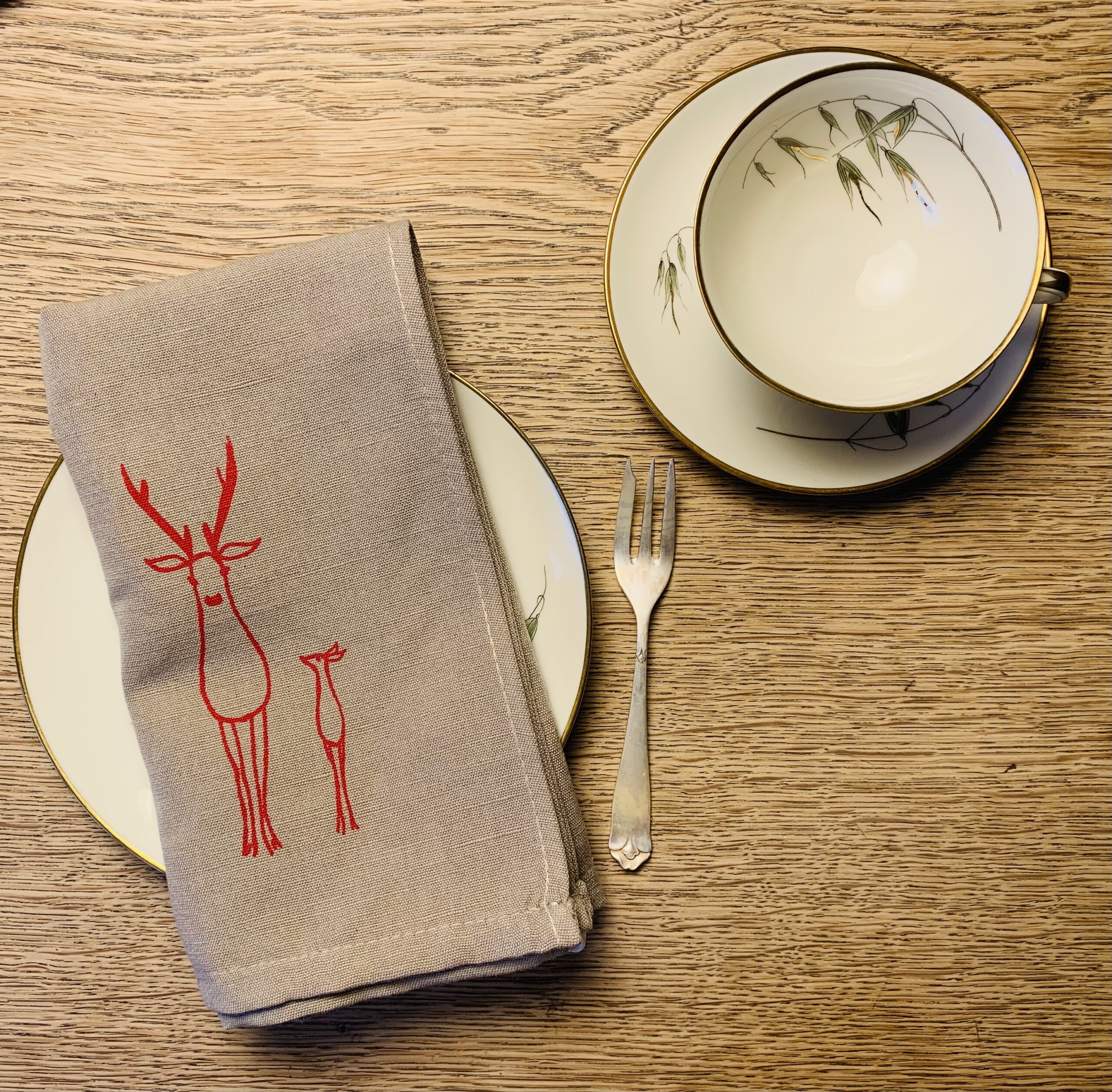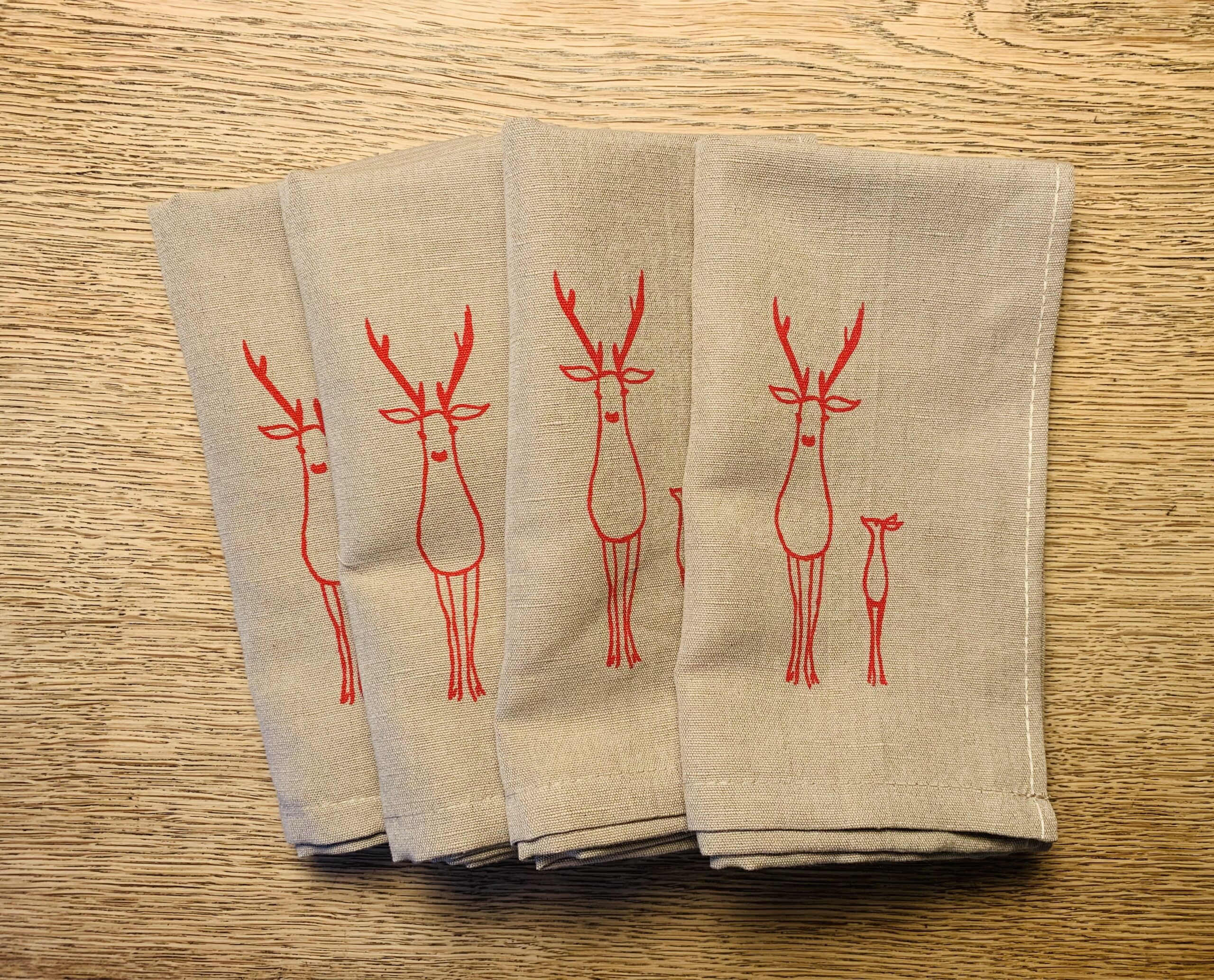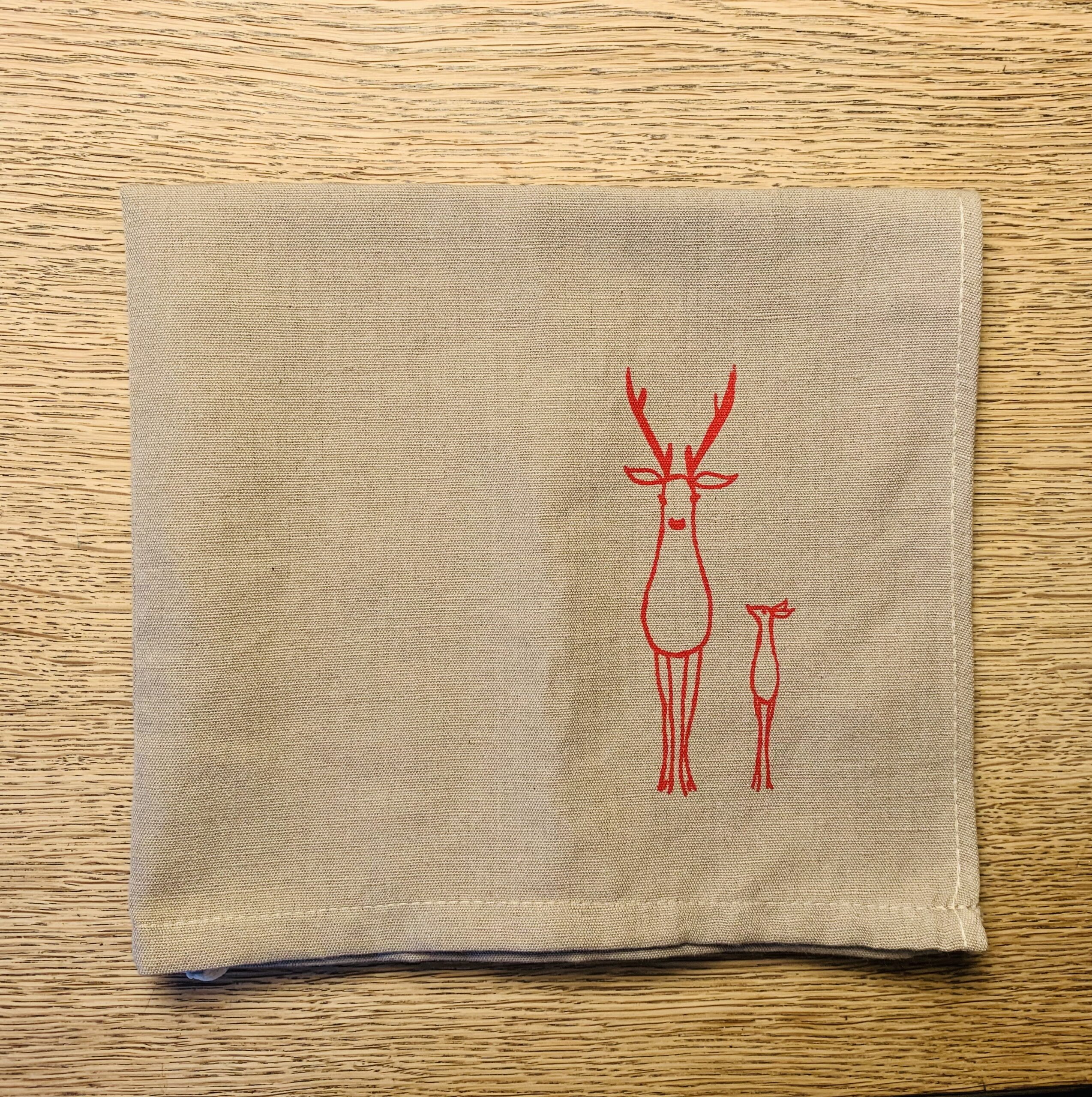 Die hochwertigen und robusten Servietten aus Halbleinen wurden per Hand mit wasserbasierter Farbe bedruckt. Jede Serviette ist ein Unikat.