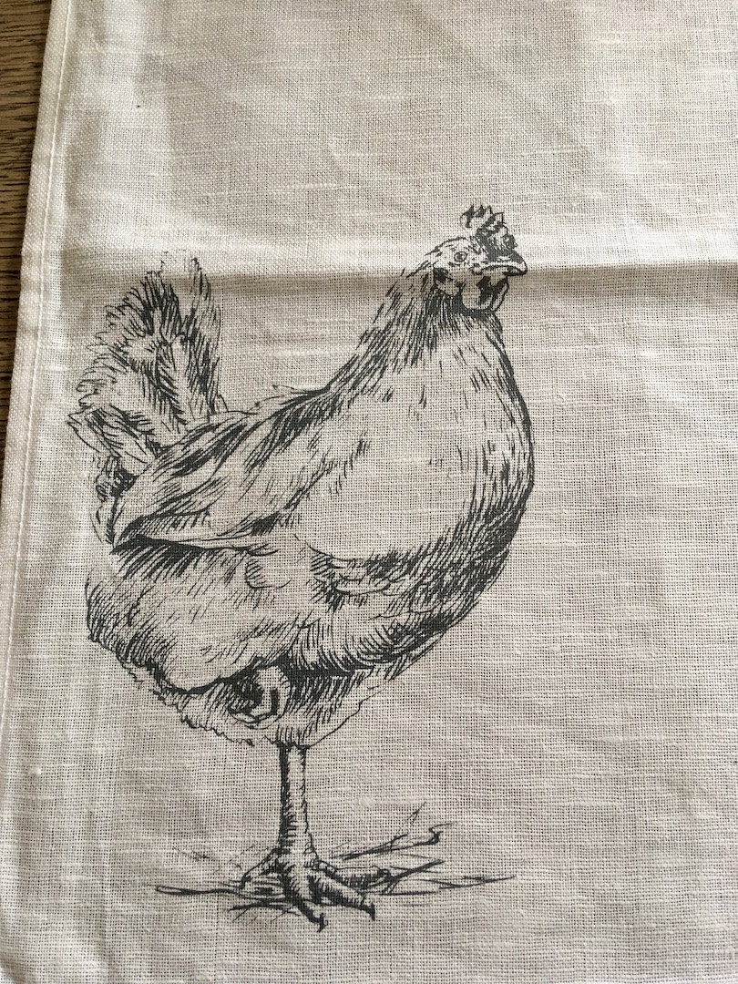 Die Motive sind jeweils an jedem Ende in der Ecke. Die Hühner stehen sich diagonal gegenüber.