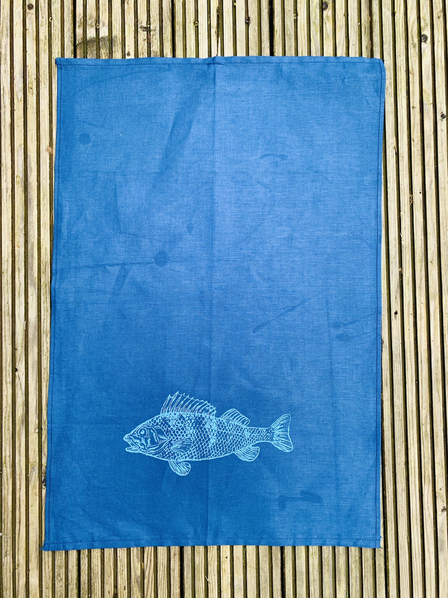 Das dunkelblaue Handtuch ist aus 50% Baumwolle/ 50 % Leinen.