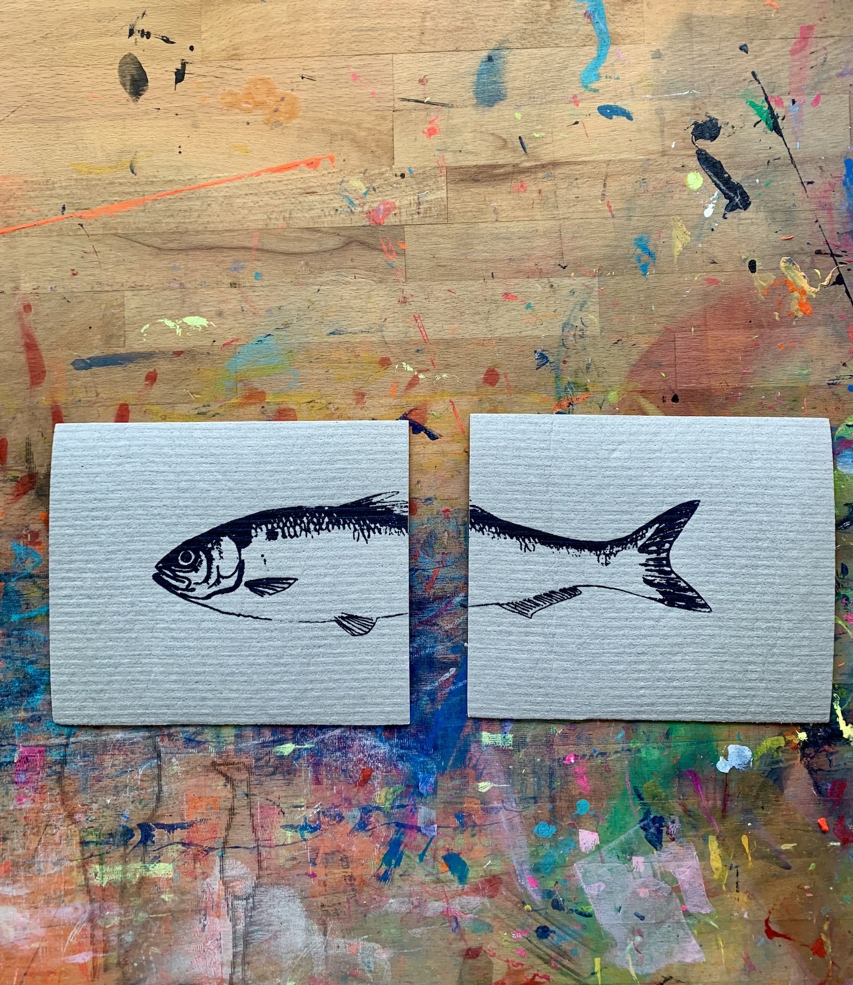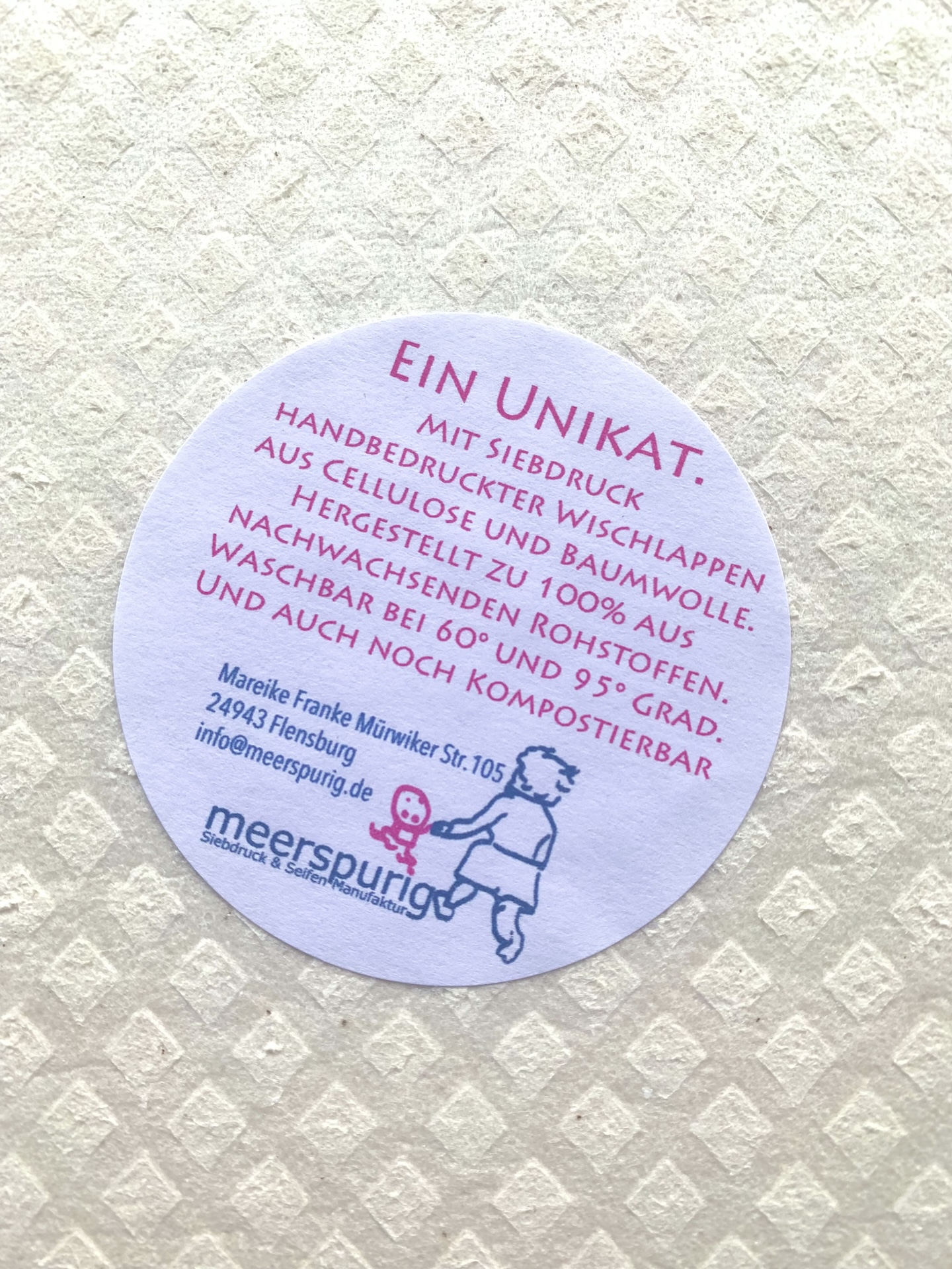Frisch, funktional, langlebig. Die Schwammtücher sind per Hand mit Siebdruck bedruckt. Ein Unikat. Die Tücher bestehen aus einem Holz-Cellulose-Baumwollmix. Herstellung aus 100% nachwachsenden Rohstoffen.