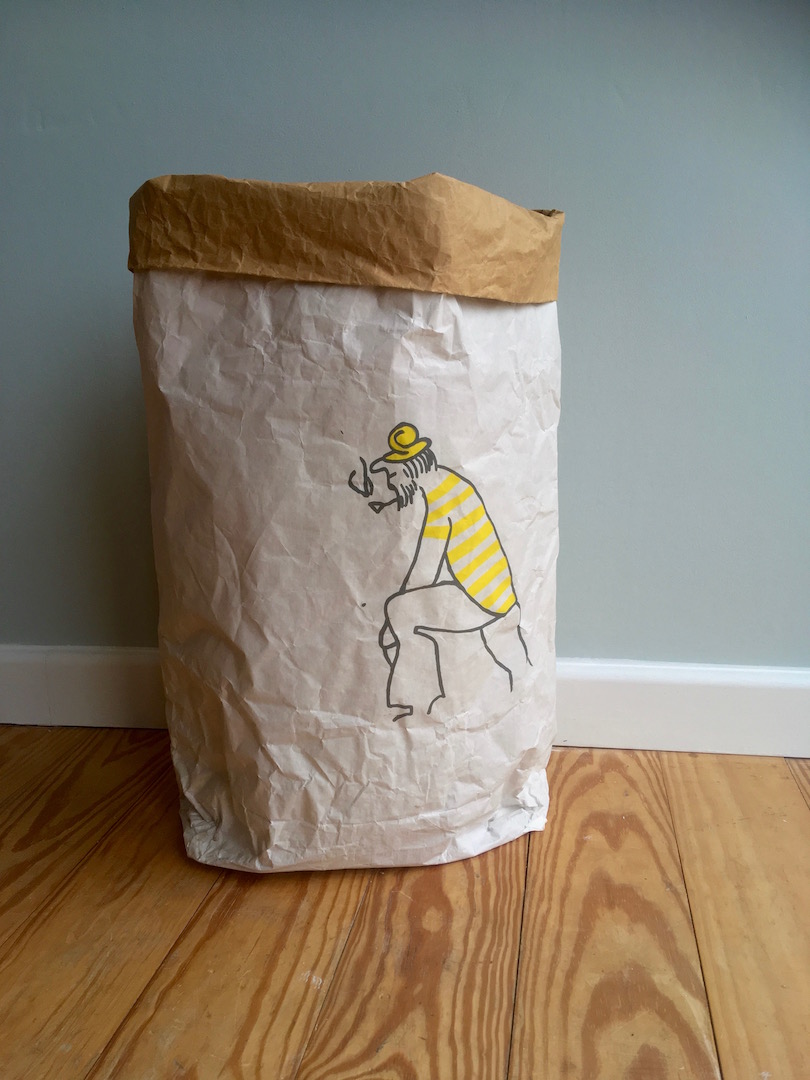 Flotter Papiersack für alle Lebenslagen. Aufbewahrung von Kissen, Decken, Geschenkrollen, Papierabfällen und einiges “meer”. Auch als Wäschesack fürs Zimmer zu empfehlen. Der stabile Papiersack ist aus zweilagigem Kraftpackpapier, innen braun und außen weiß.