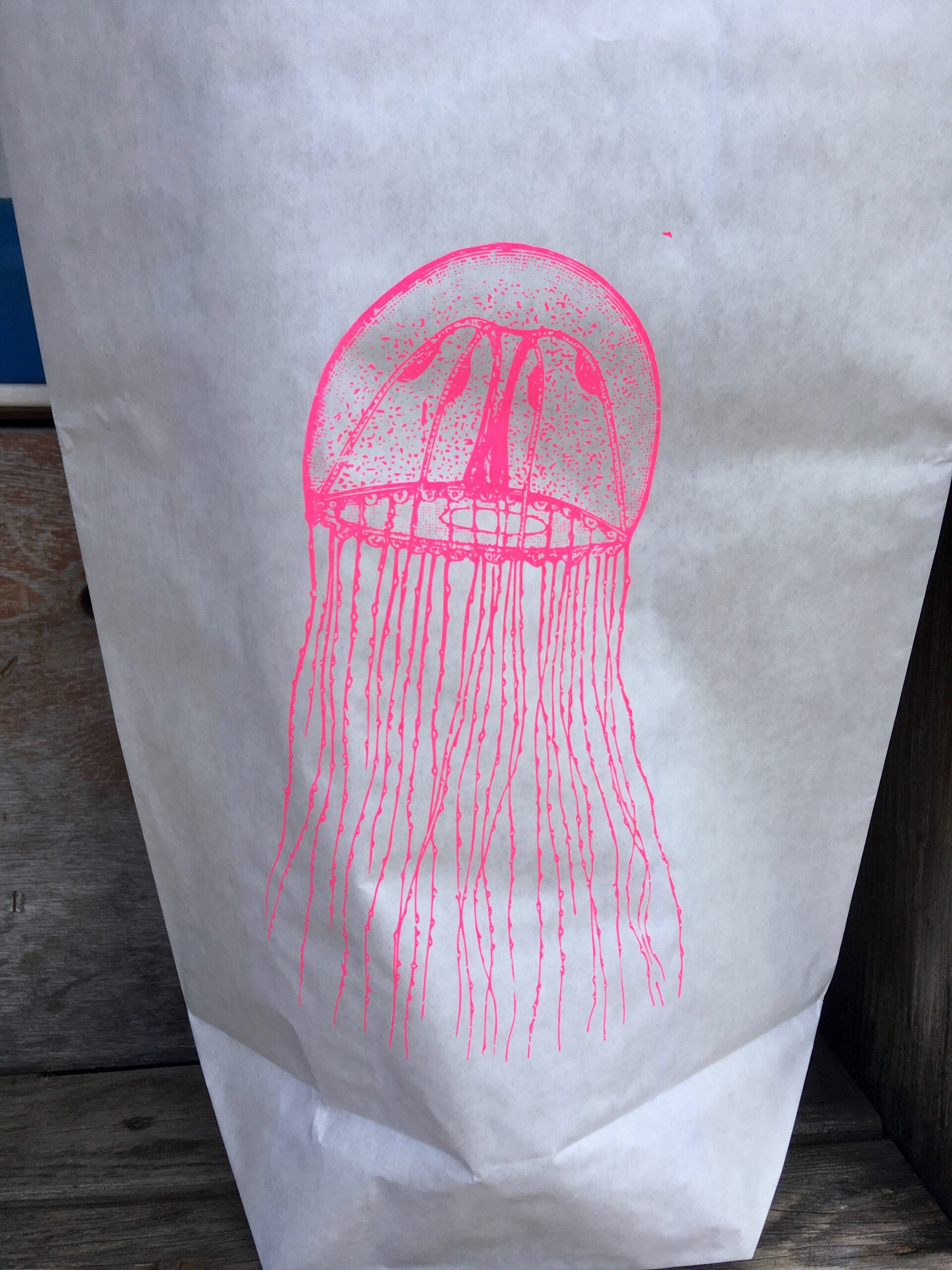 Per Hand mit Siebdruck und wasserbasierter Farbe bedruckt. Jeder Sack ist ein Unikat.