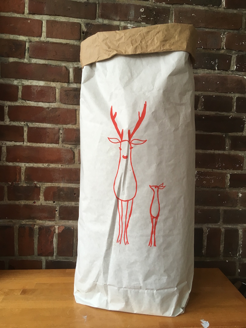 Flotter Papiersack für alle Lebenslagen. Aufbewahrung von Kissen, Decken, Geschenkrollen, Papierabfällen, auch für Holz am Offen und einiges “meer”. Auch als Wäschesack fürs Zimmer zu empfehlen. Der stabile Papiersack ist aus zweilagigem Kraftpackpapier, innen braun und außen weiß.