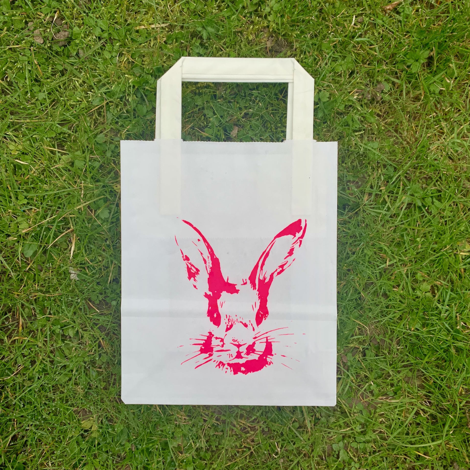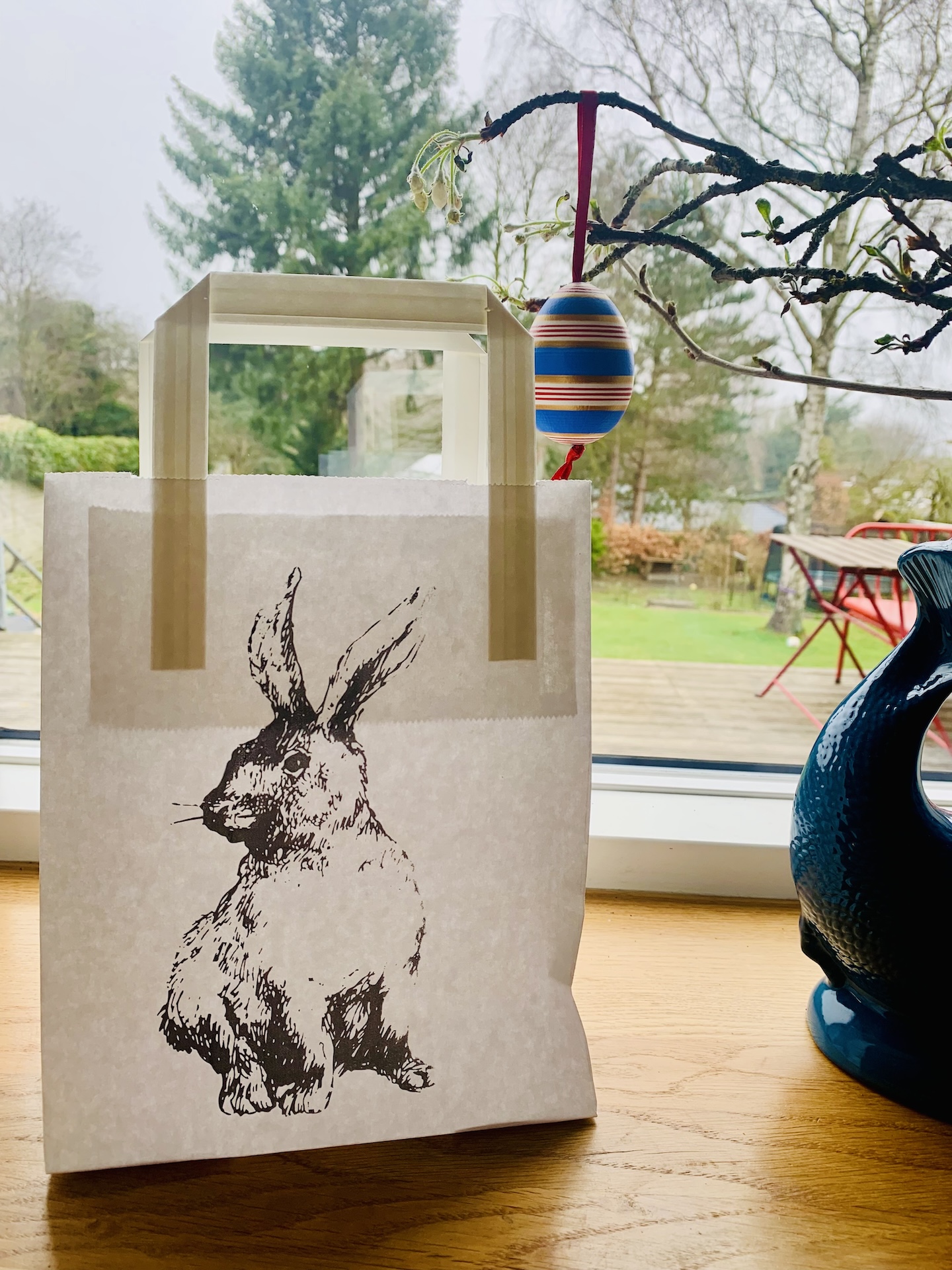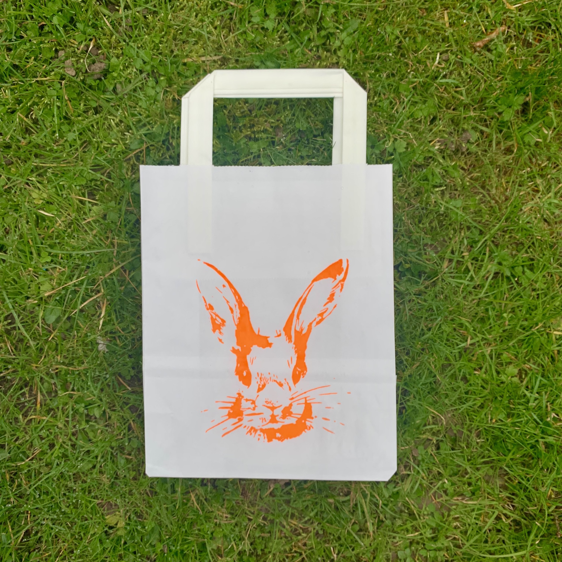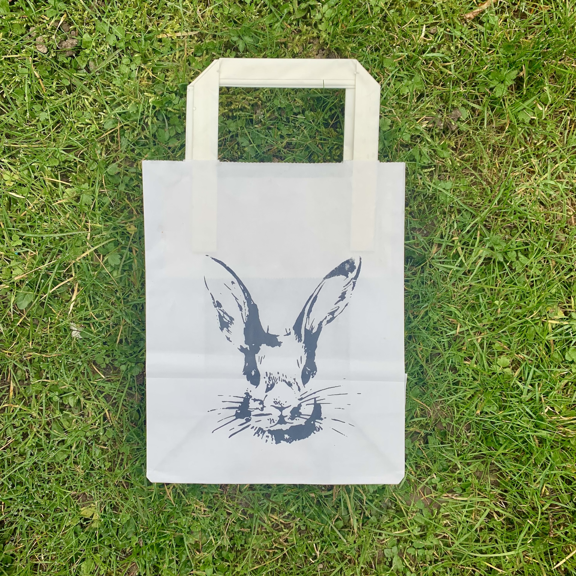 Schöne bedruckte Papiertüte mit Häschen, handsiebdruck mit wasserbasierter Farbe.