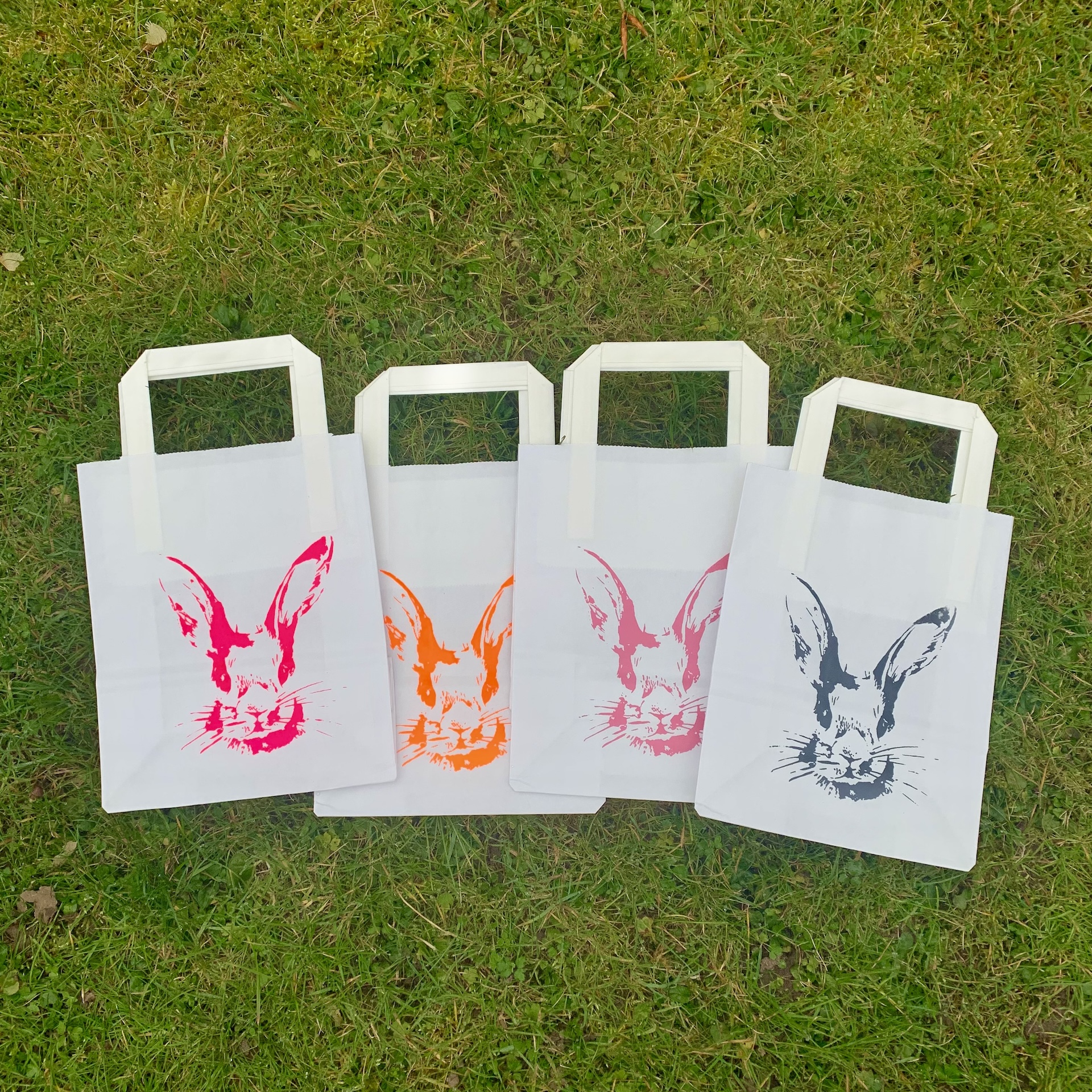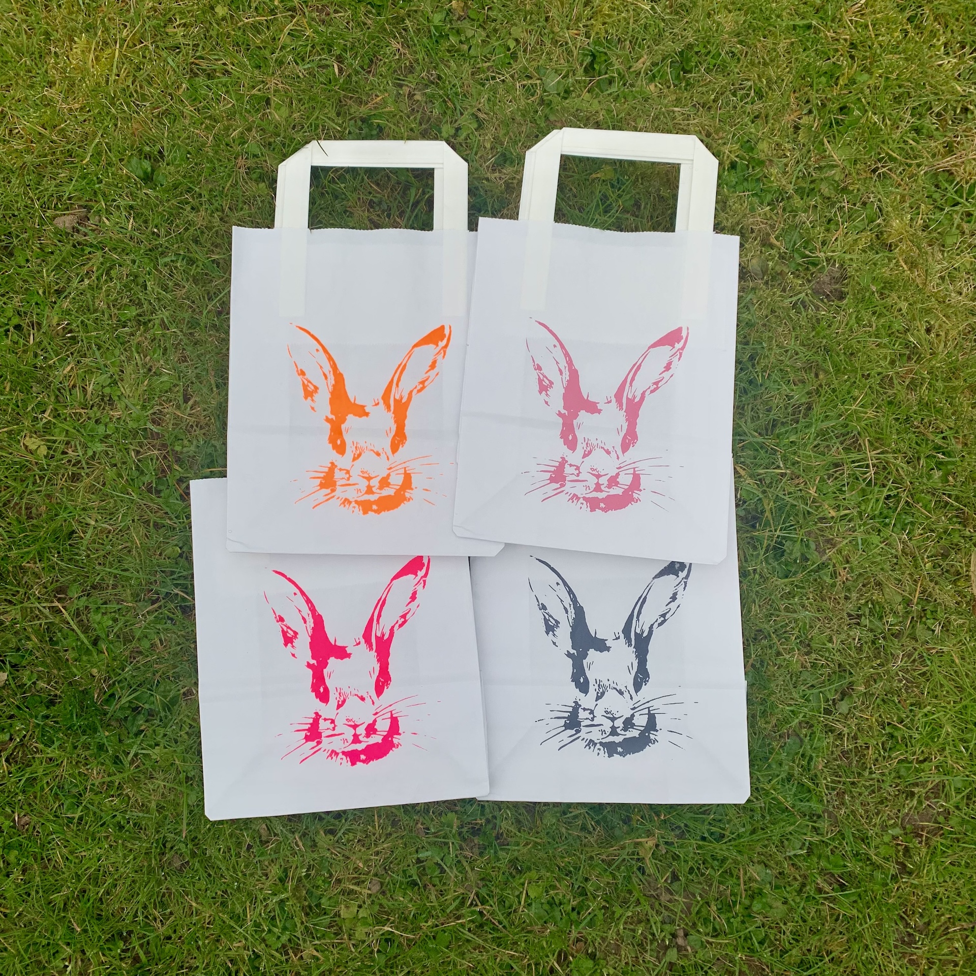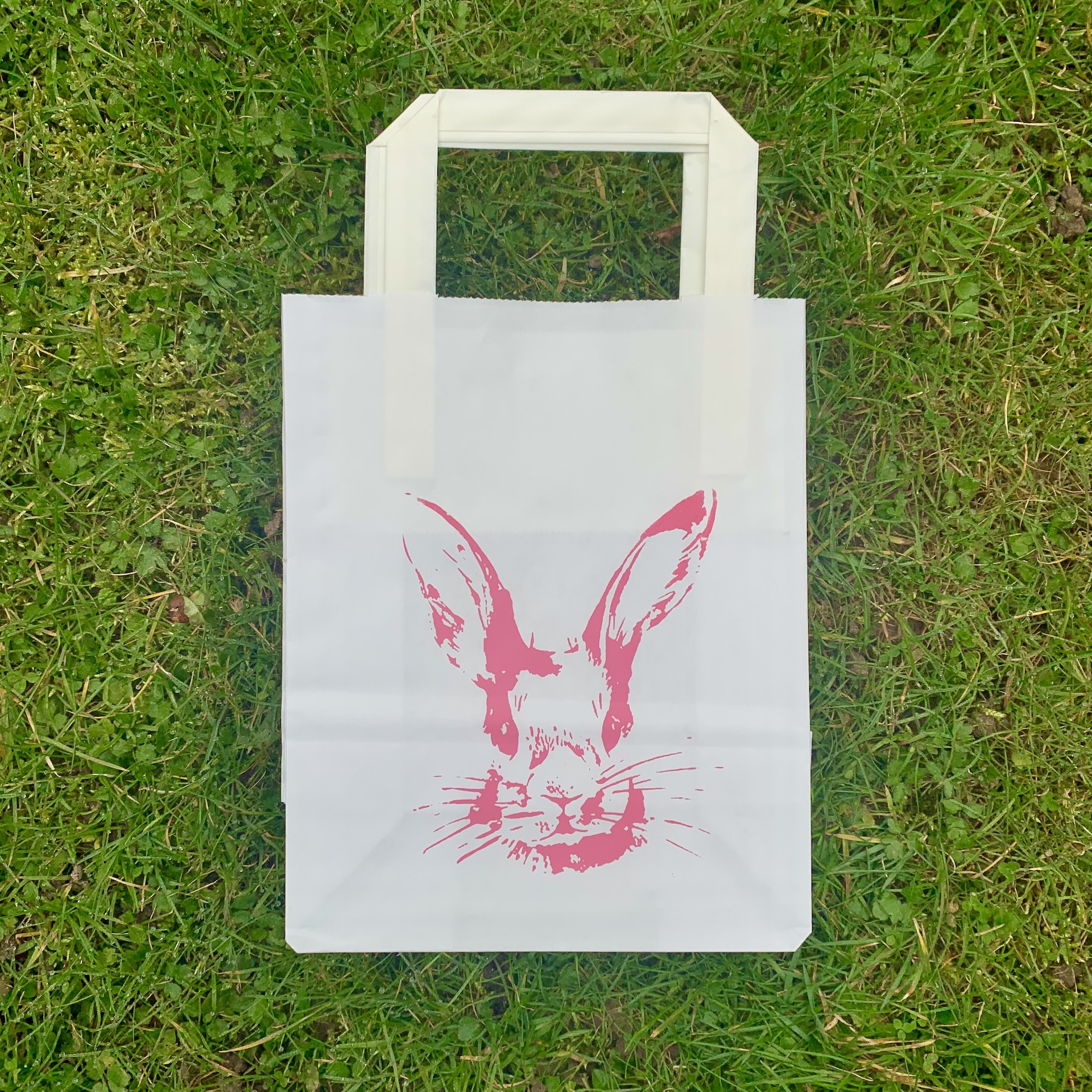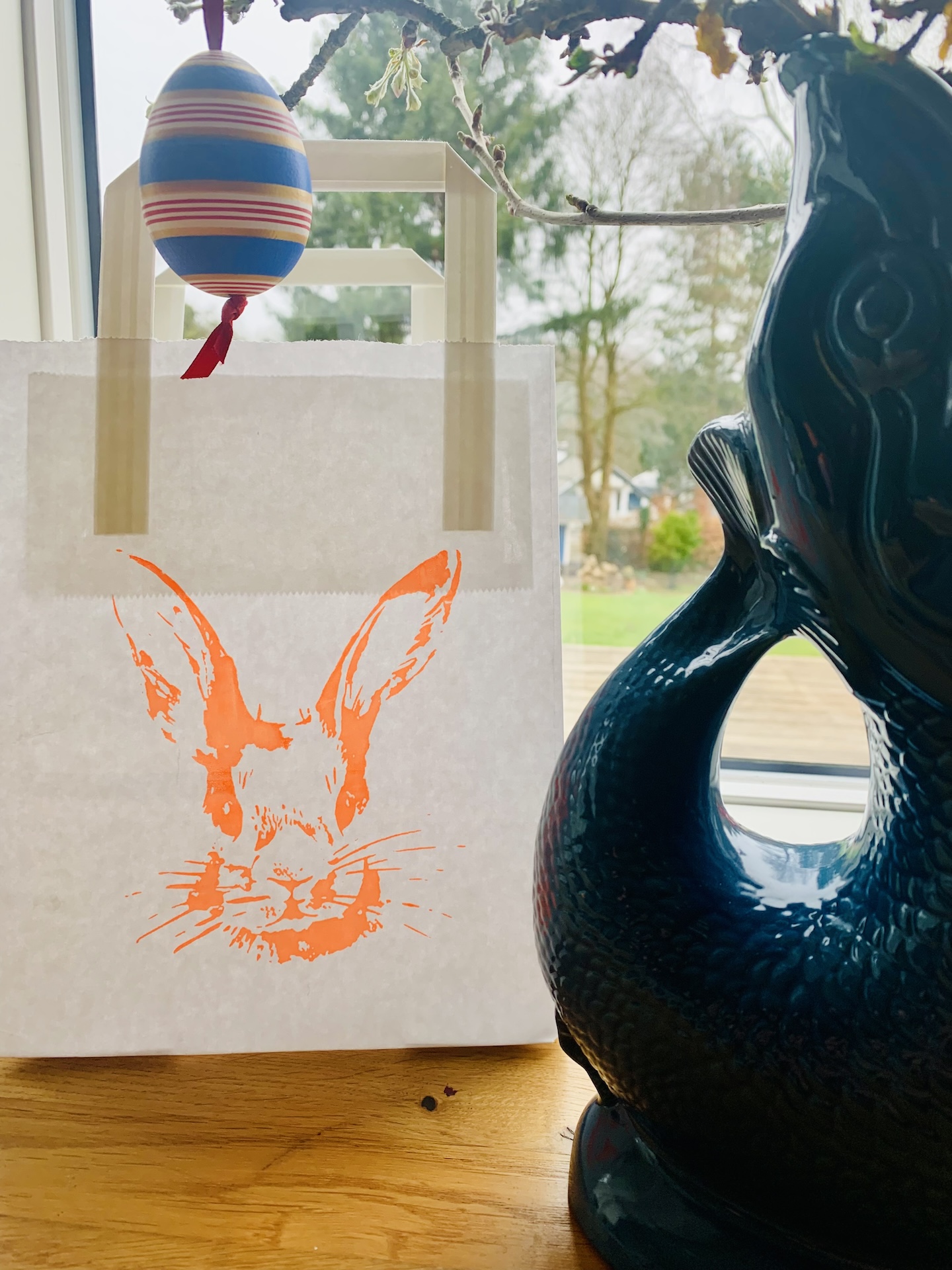 Schöne bedruckte Papiertüte mit Häschen, handsiebdruck mit wasserbasierter Farbe.