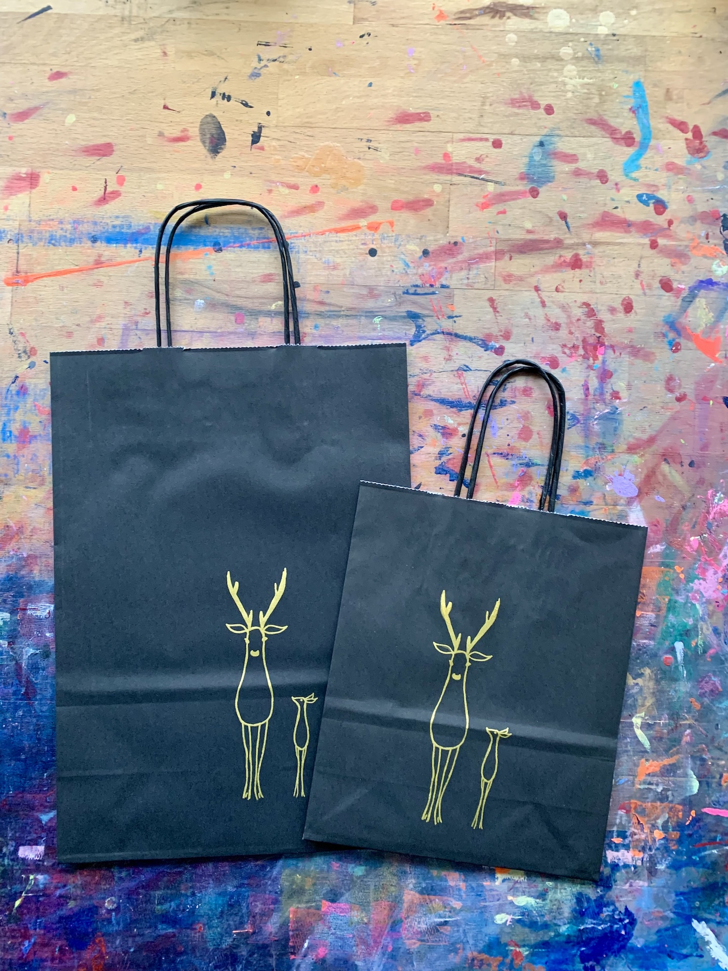 Die schwarze Tüte wurde mit wasserbasierter Goldfarbe per Hand mit Siebdruck bedruckt.