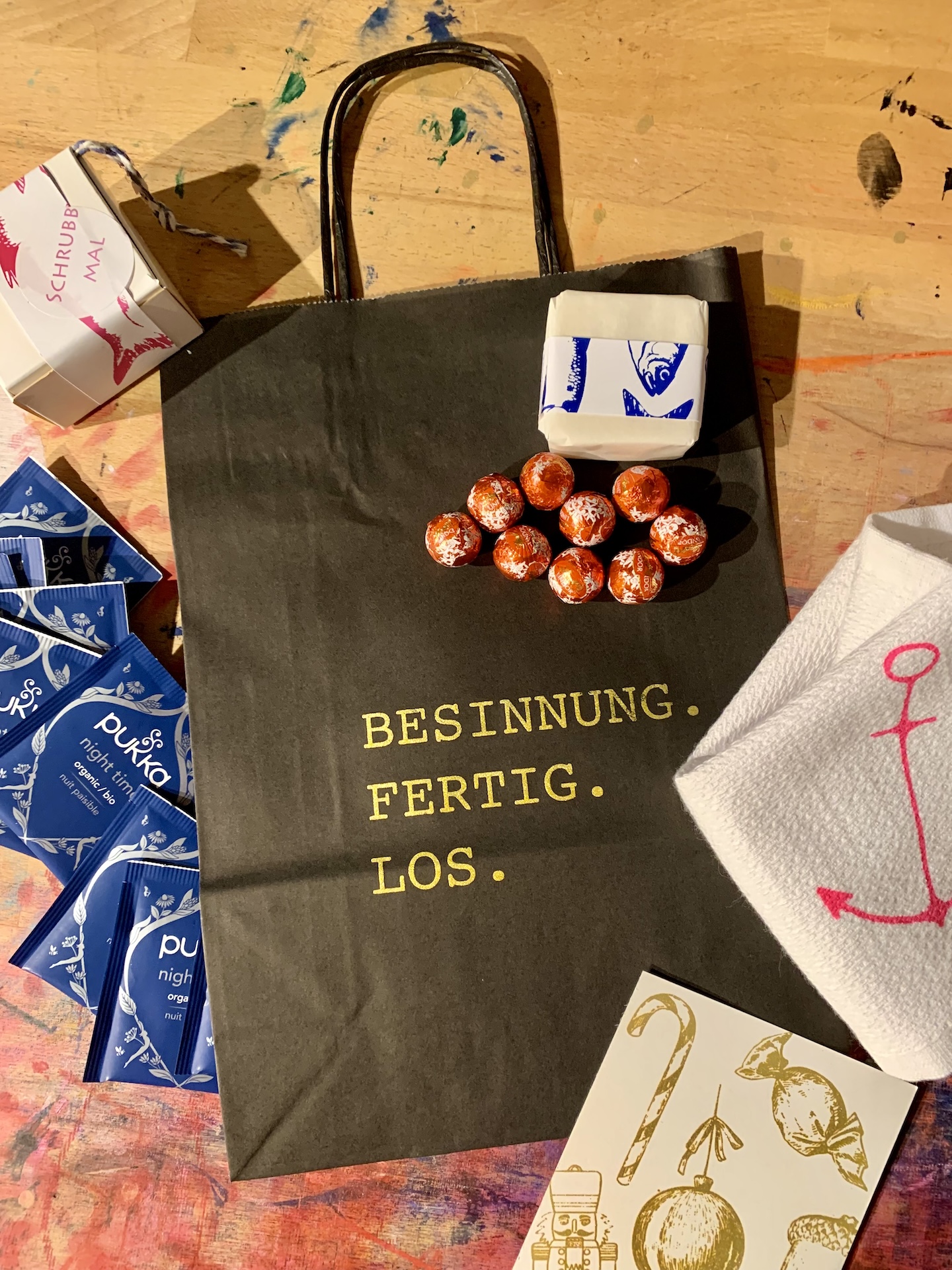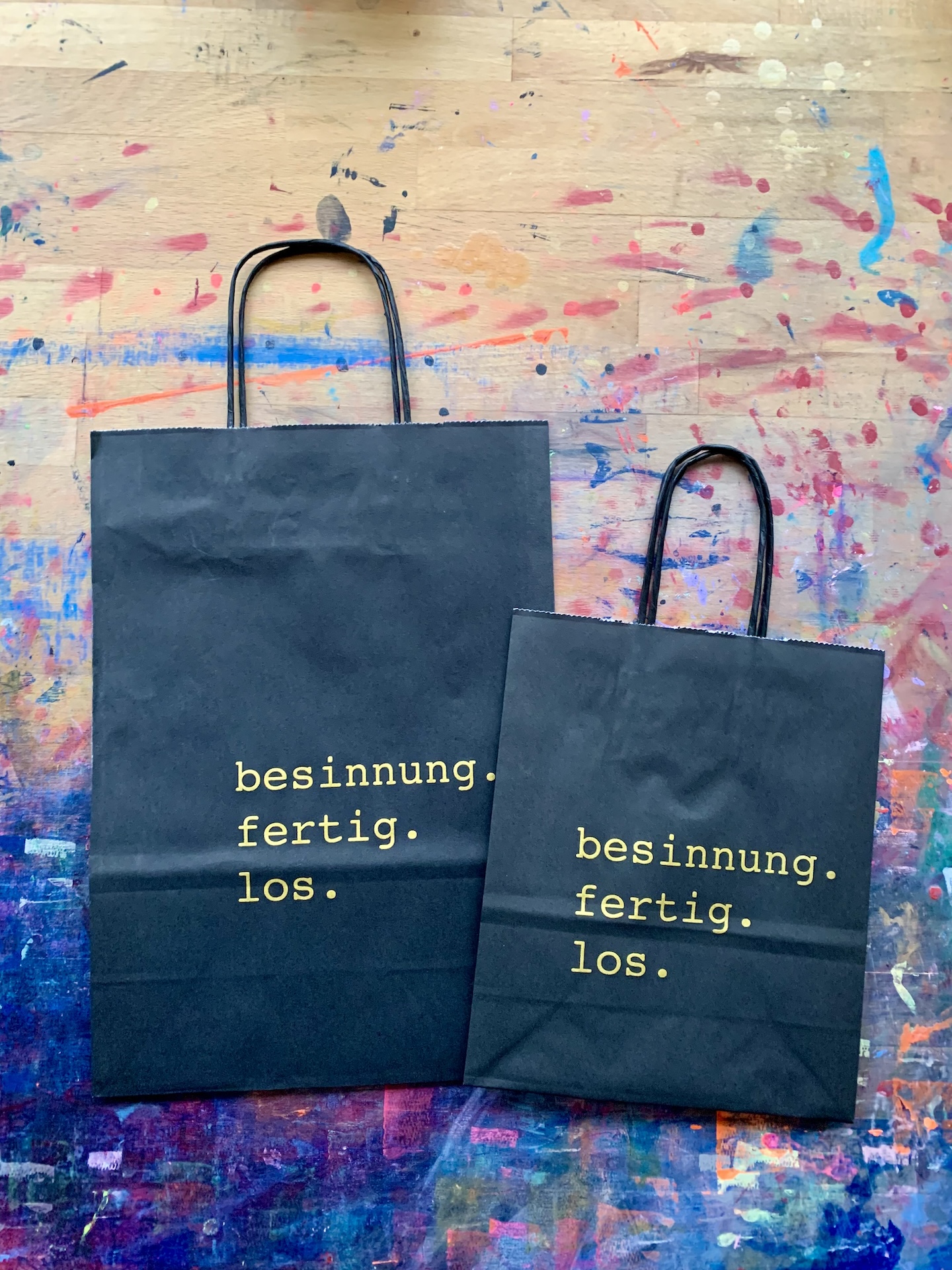 Handbedruckt mit Siebdruck. Jede Tüte ist ein Unikat.