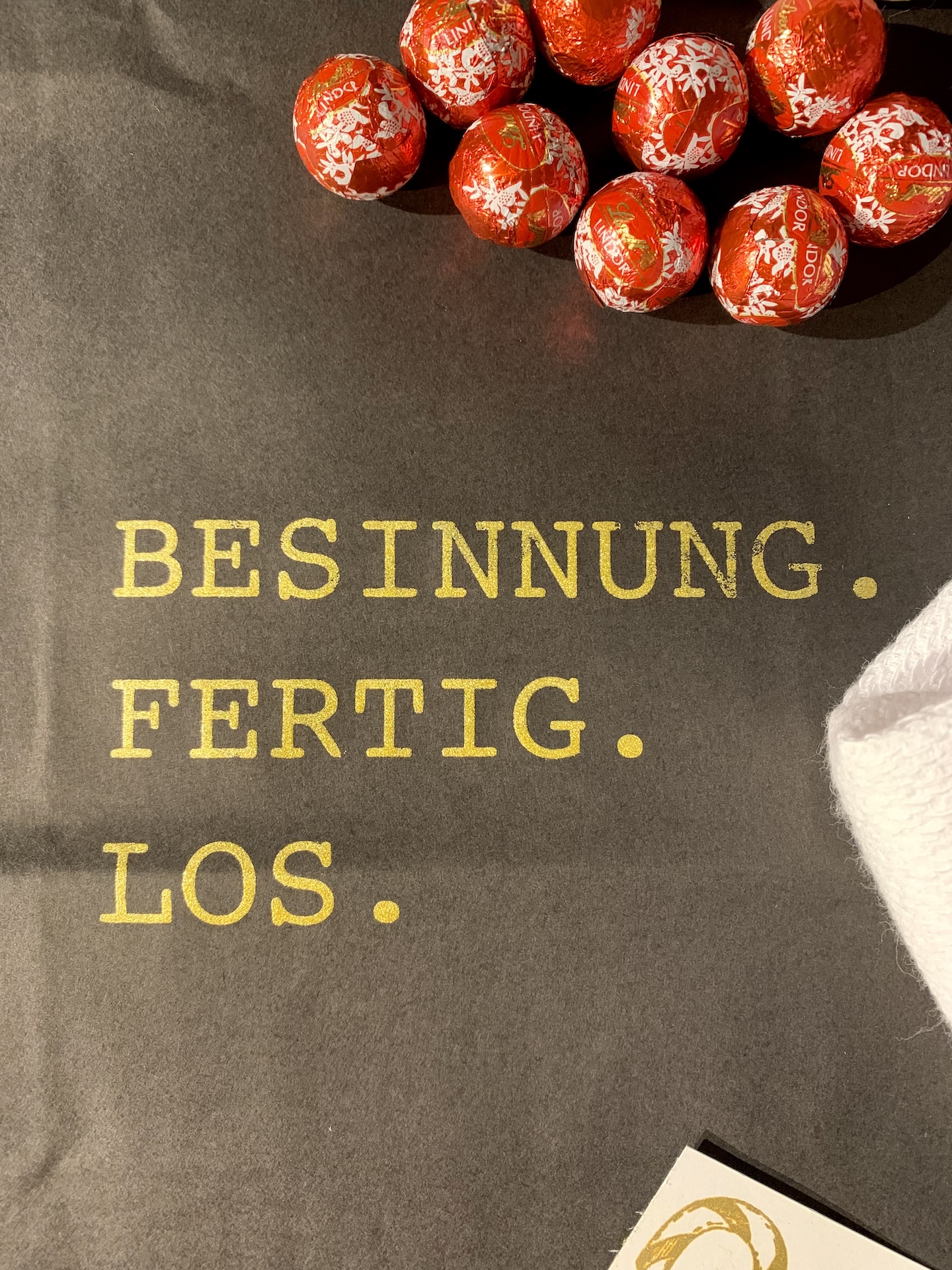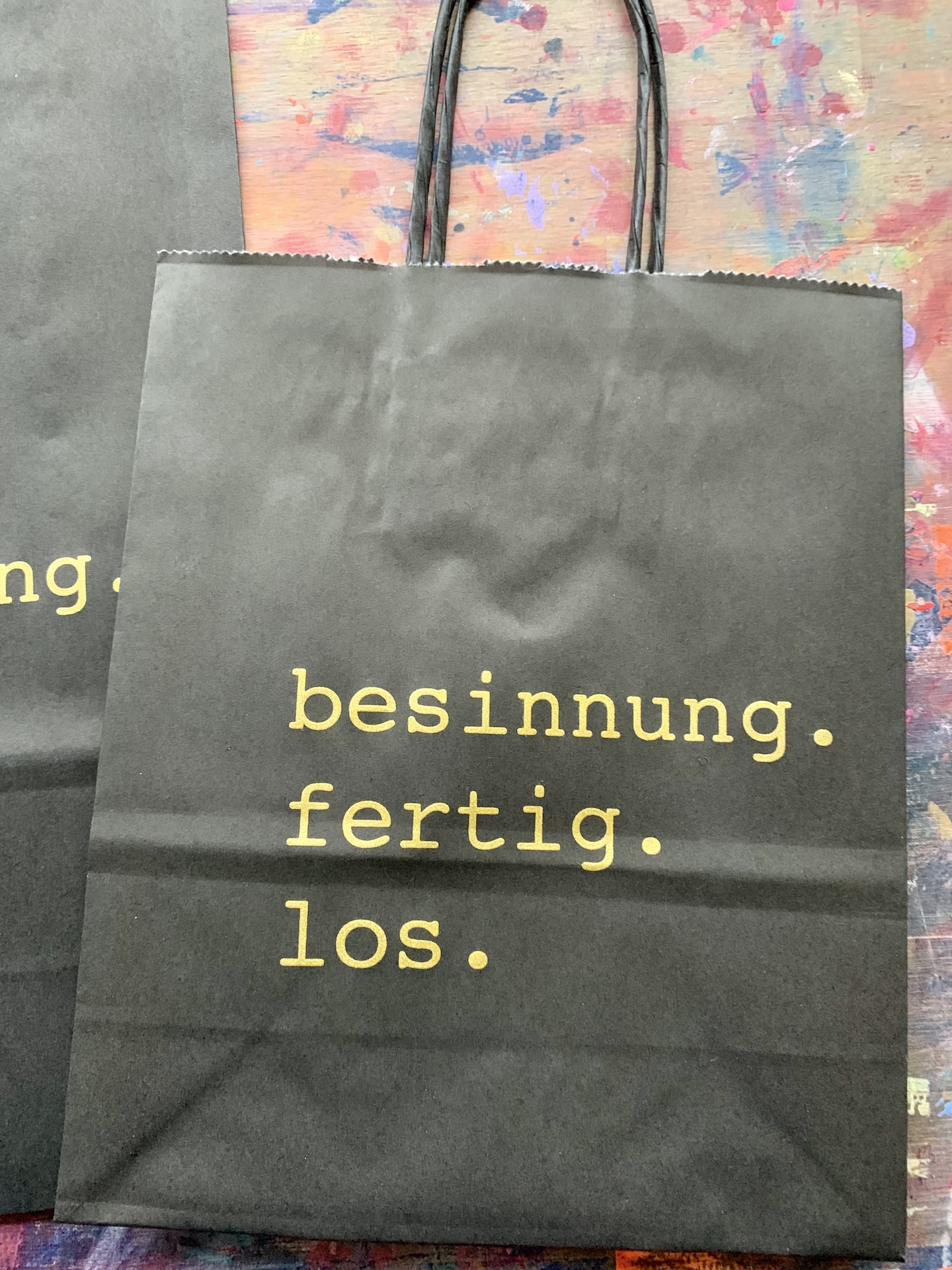 Die schwarze Tüte wurde mit wasserbasierter Goldfarbe per Hand mit Siebdruck bedruckt.