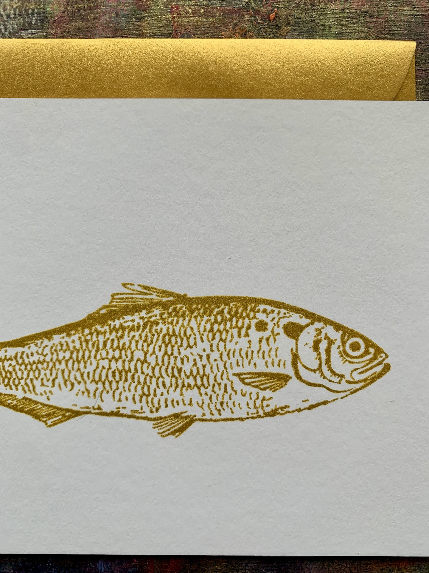 Goldige handbedruckte Karte inklusive Umschlag.