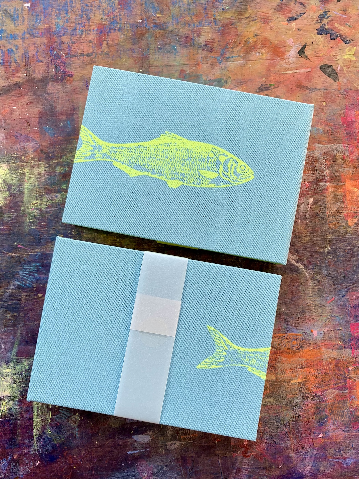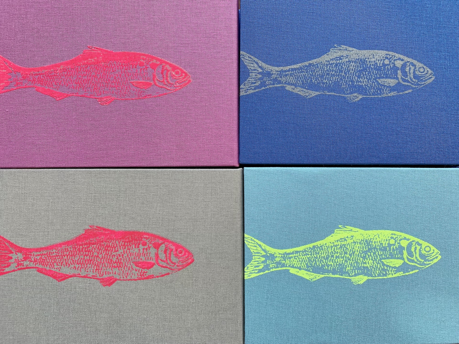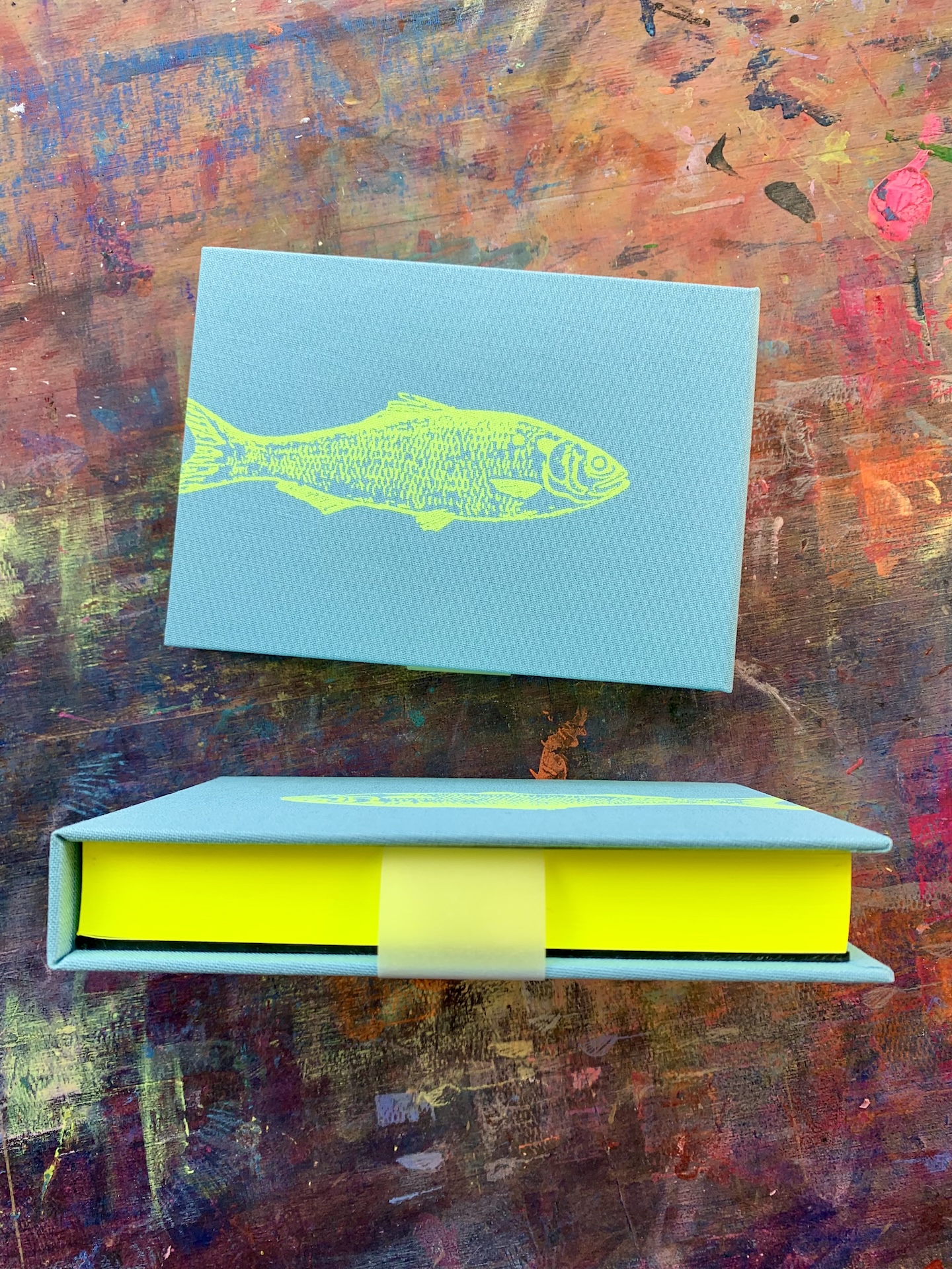Handebundener und handgesiebdruckter Farbschnittzettelblock mit Fisch.