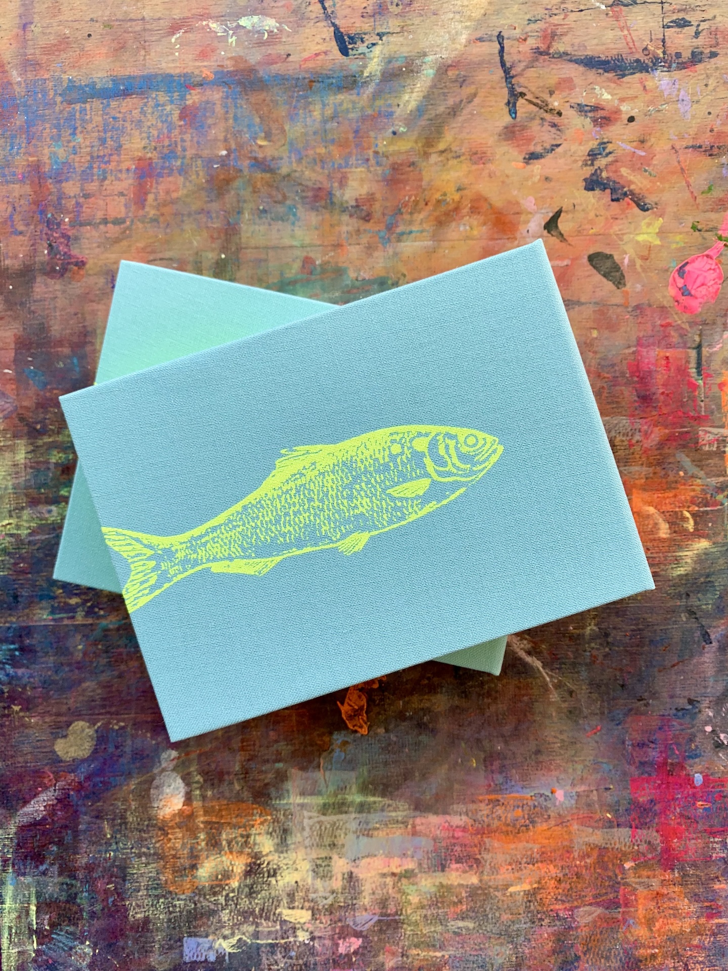 Farbschnittzettelblock mit handgesiebdrucktem Fisch.