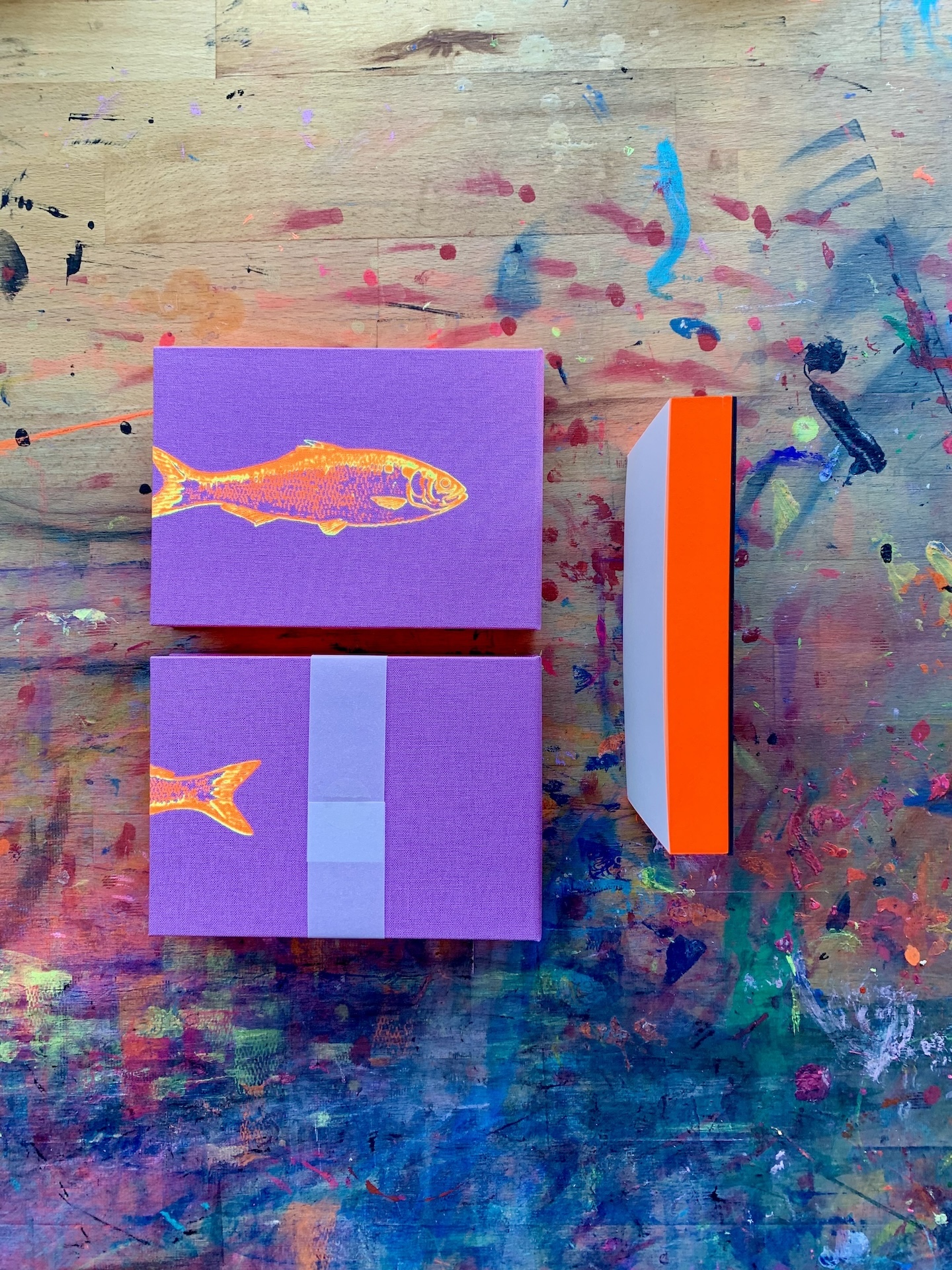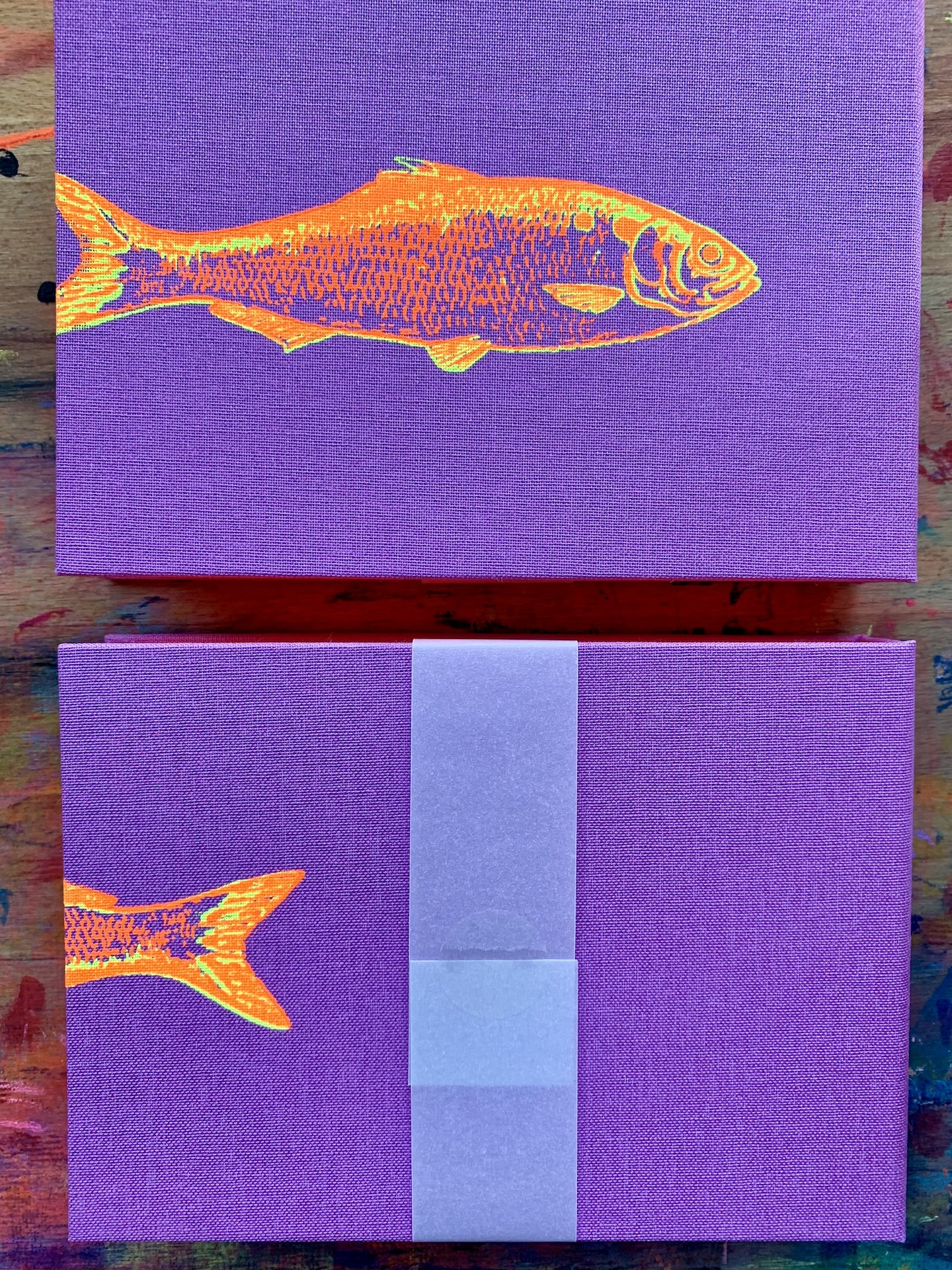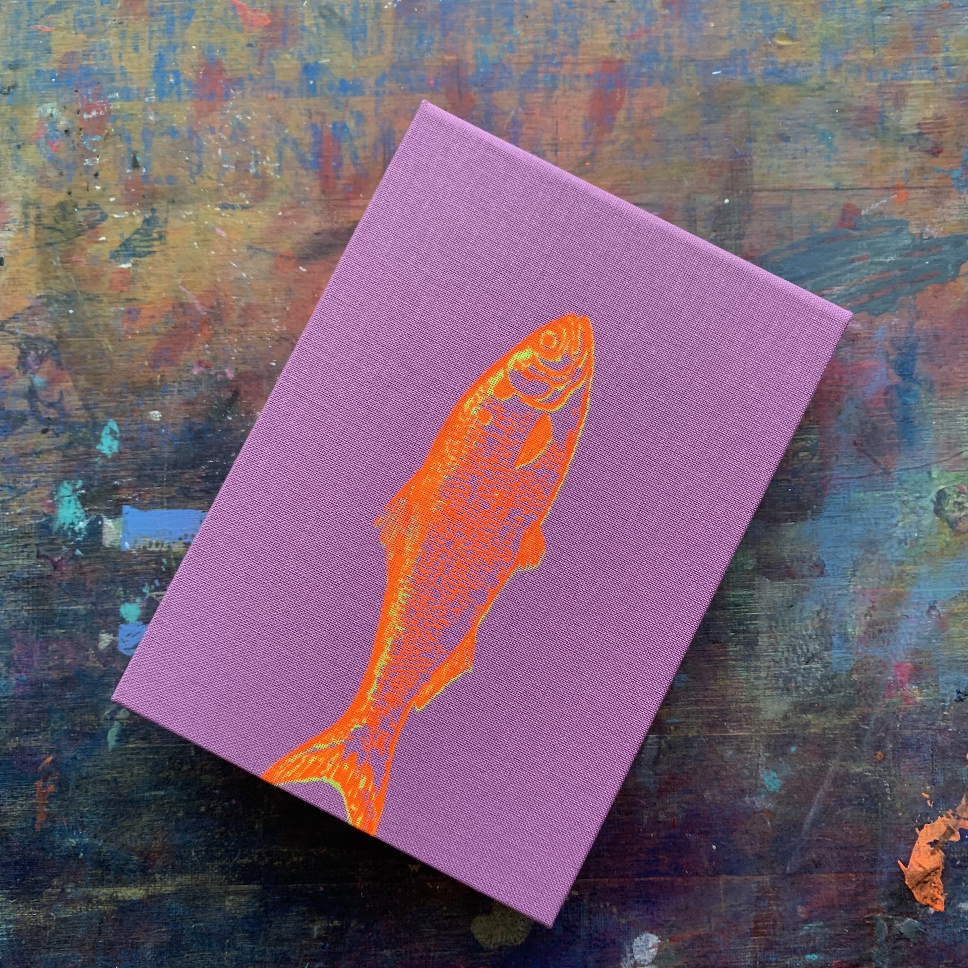 Handebundener und handgesiebdruckter Farbschnittzettelblock mit Fisch.