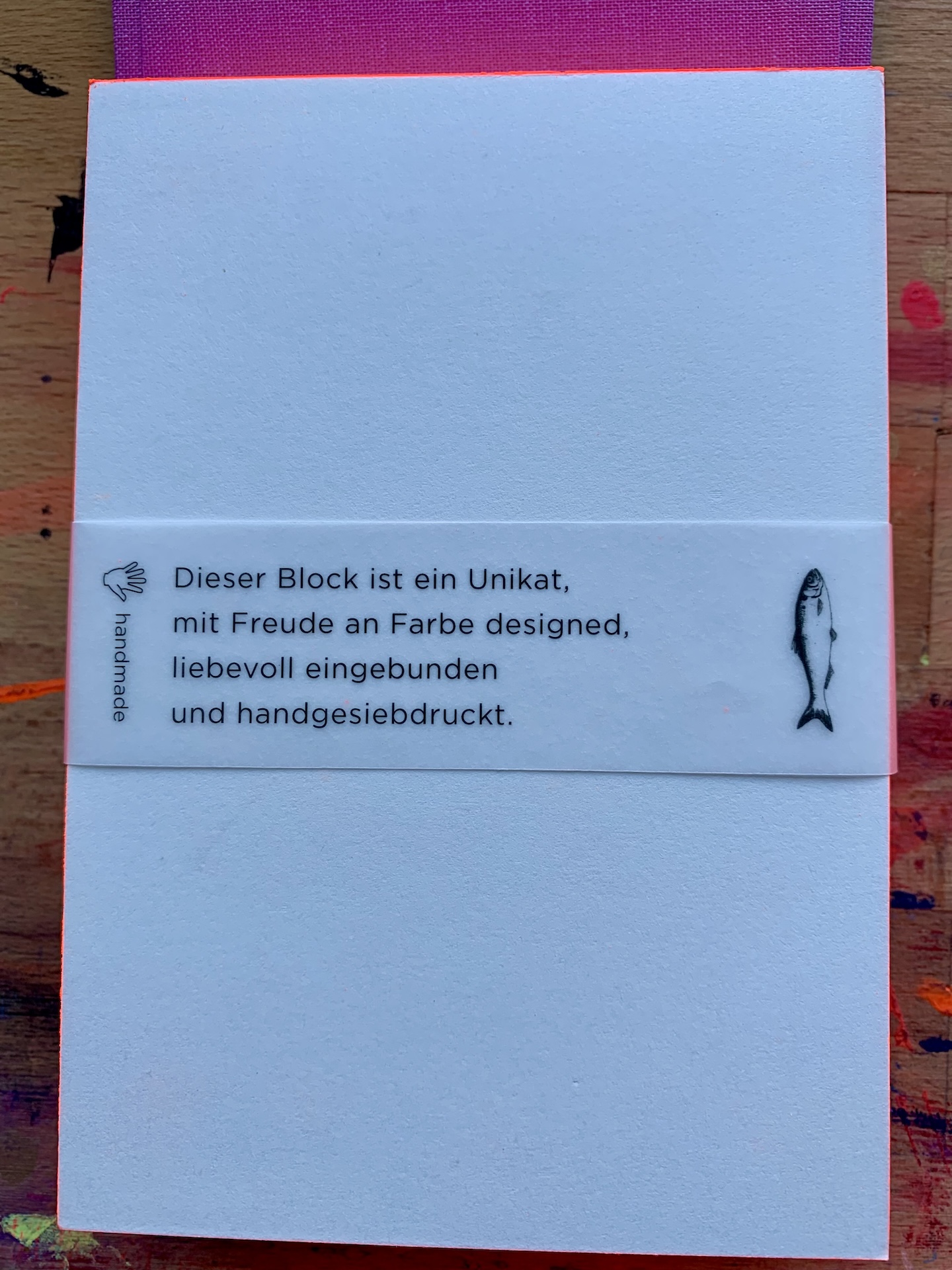 Farbschnittzettelblock mit handgesiebdrucktem Fisch.
