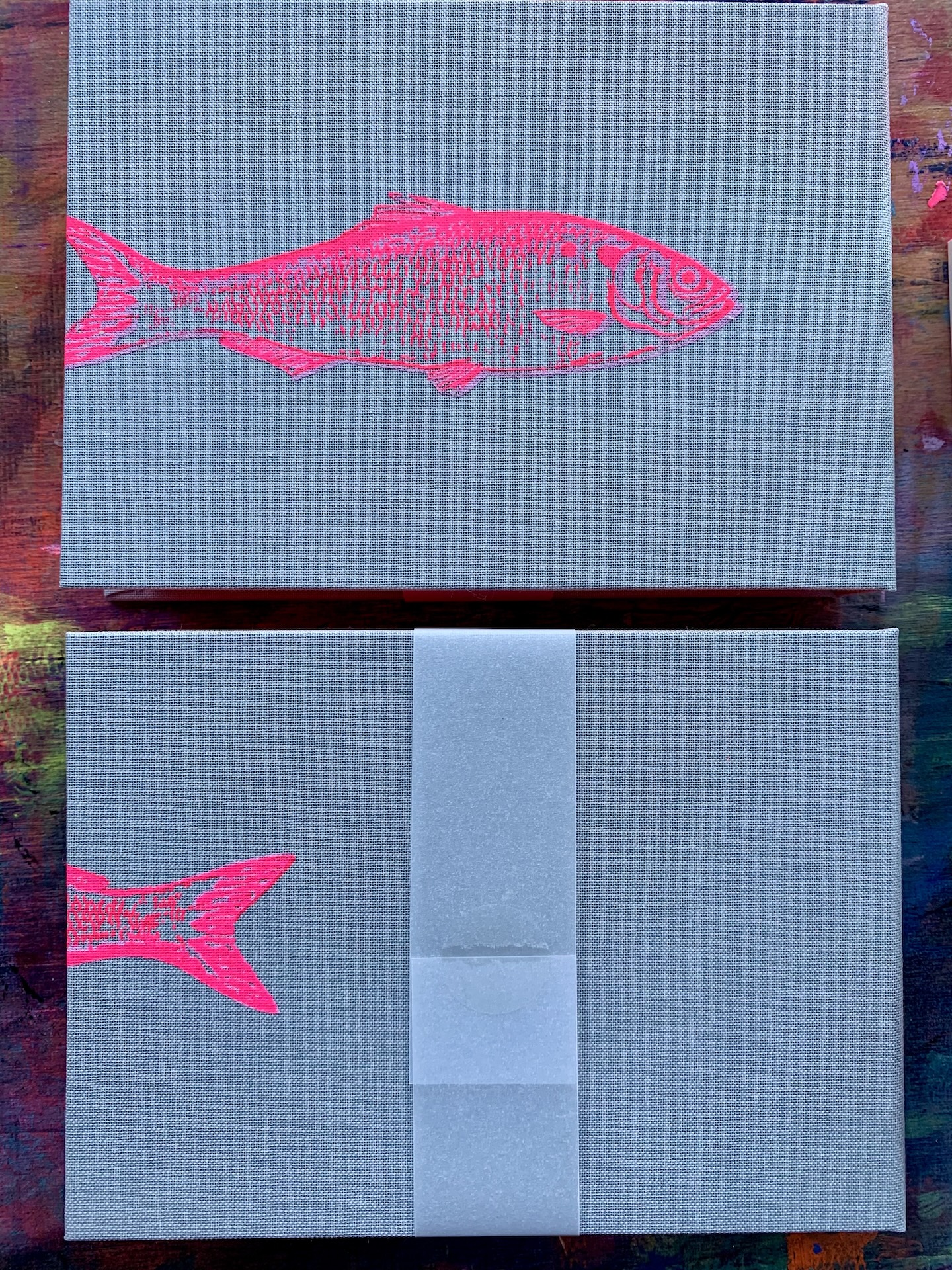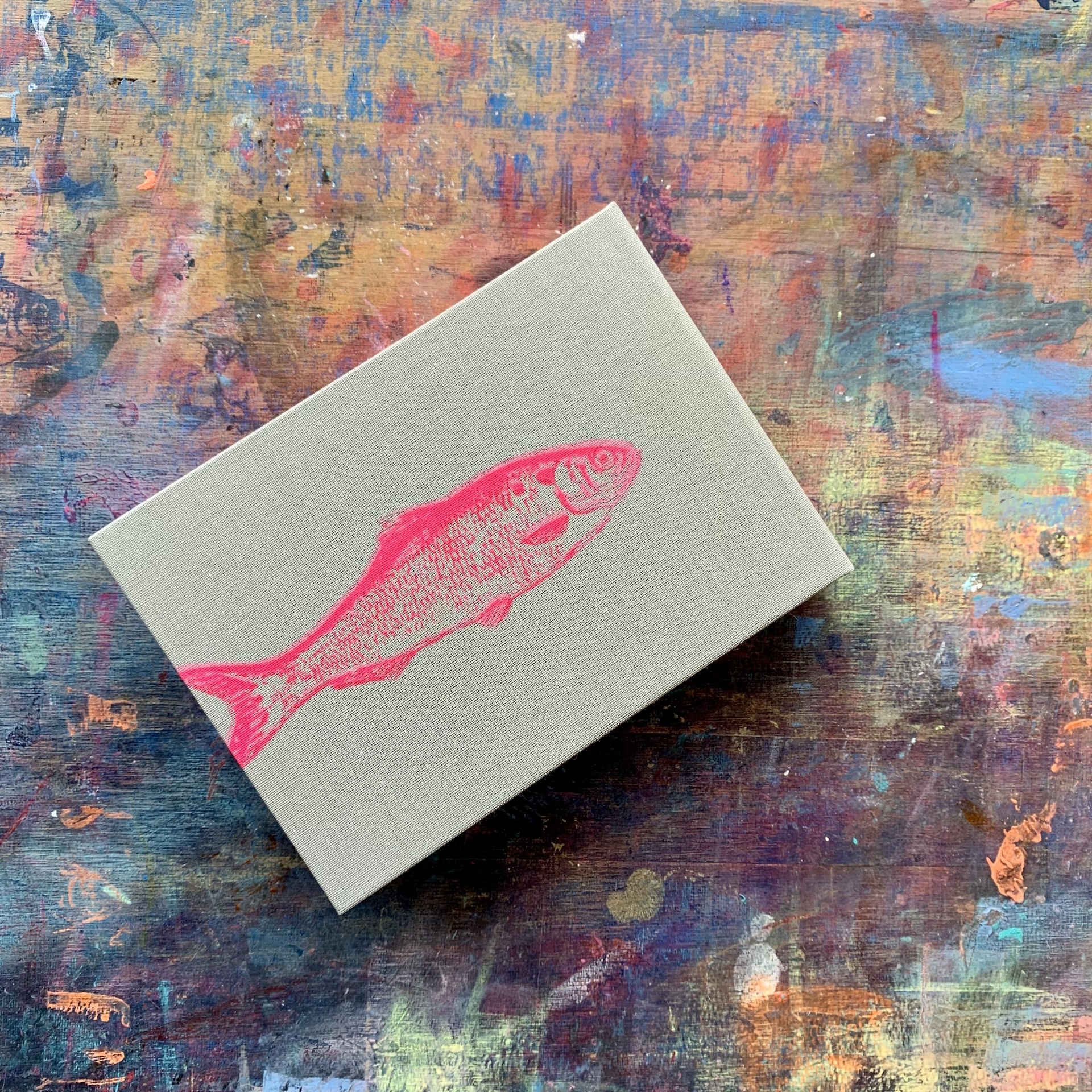 Handebundener und handgesiebdruckter Farbschnittzettelblock mit Fisch.