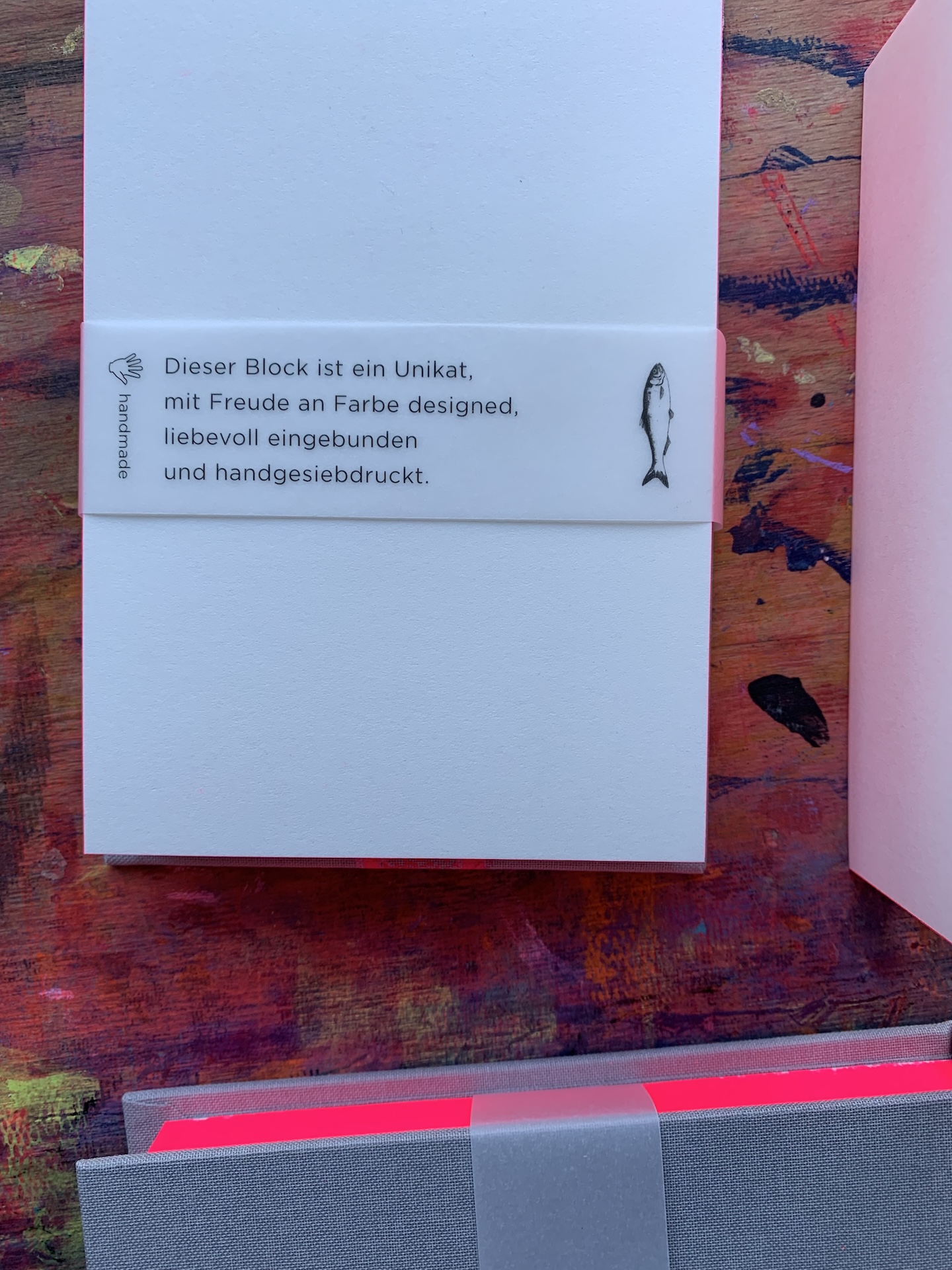 Farbschnittzettelblock mit handgesiebdrucktem Fisch.